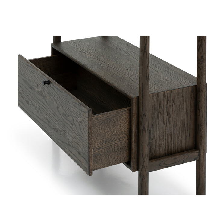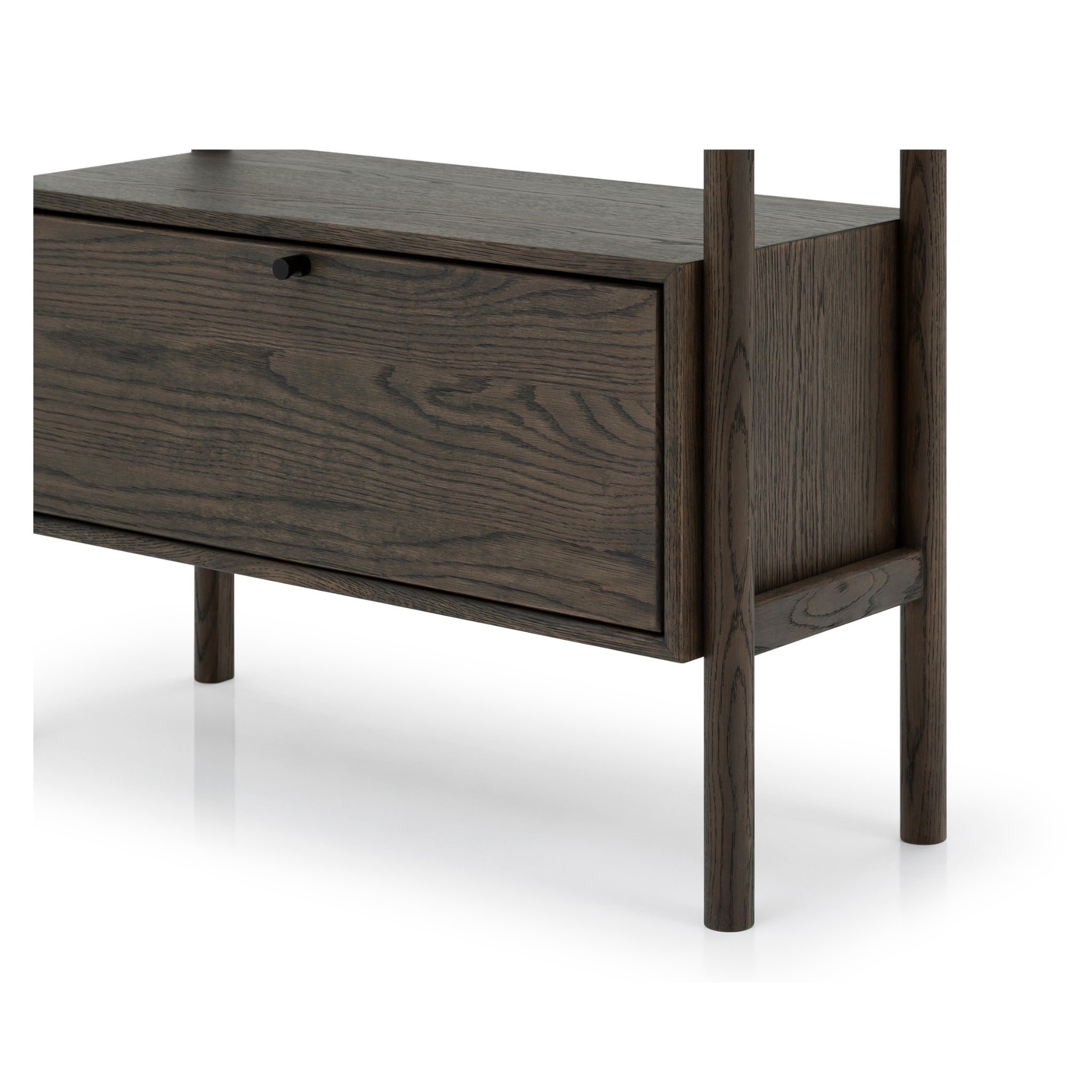 Franz brings together design and utility, offering airy open shelves for books and décor, paired with a seamless drawer on metal rails for hidden storage. The matte lacquer finish enhances the natural feel of oak while making the surface easy to care for, so it stays looking its best for years.