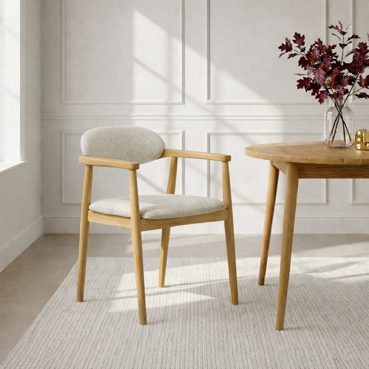 Upholstered in a soft, light beige fabric, the seat and backrest add a layer of quiet comfort while highlighting the natural matte lacquer finish of the oak frame. The finish enhances the wood’s rich grain, giving the chair an understated sense of exclusivity.