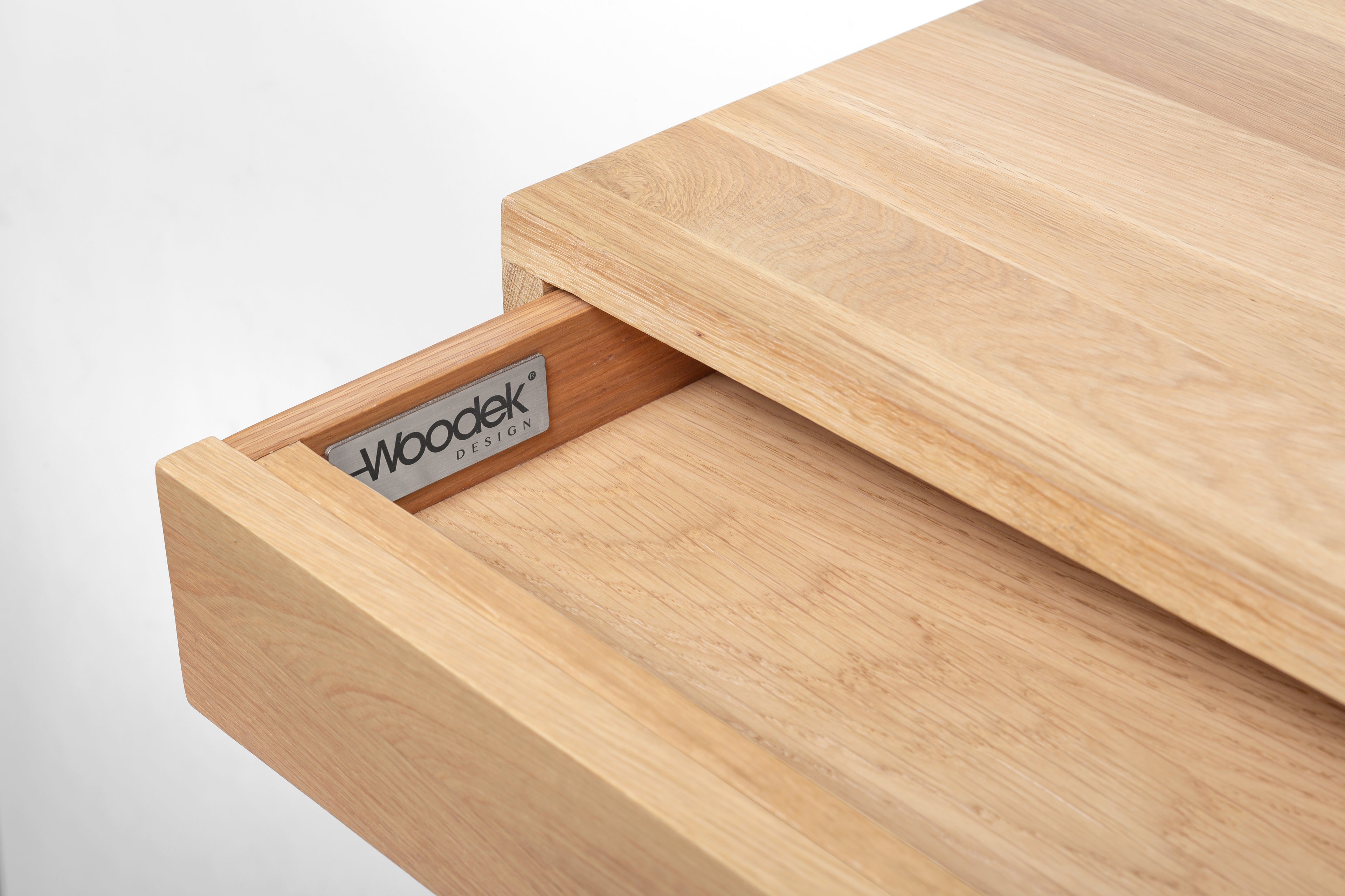 Its single drawer glides smoothly on metal rails, giving you just the right amount of storage for essentials. Finished in matte lacquer, the oak surface feels natural and warm while remaining easy to care for.