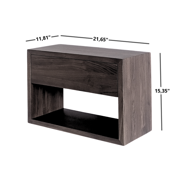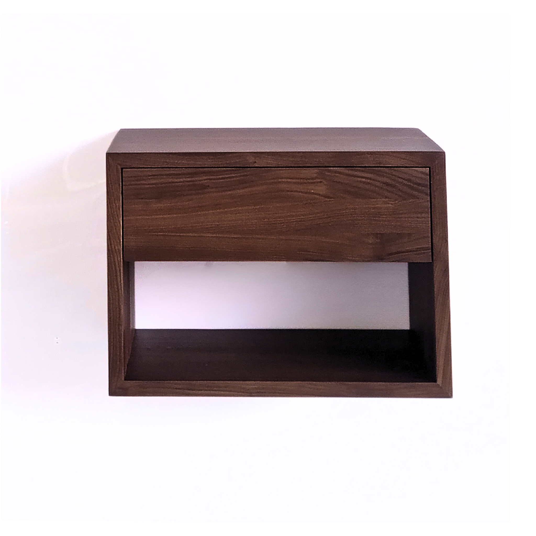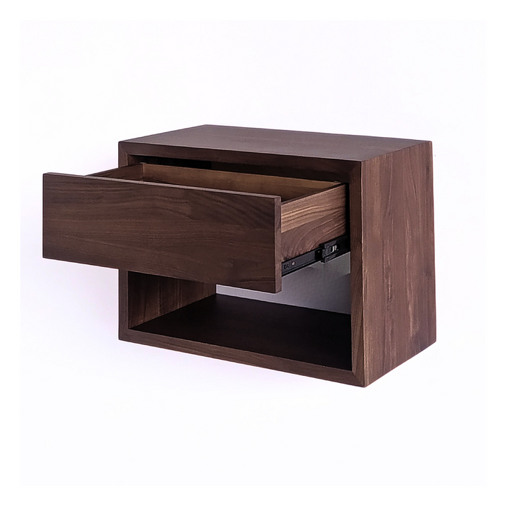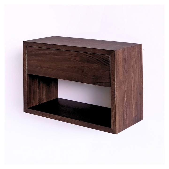 The Hugo floating nightstand is crafted from solid walnut hardwood, bringing rich color and timeless character into your bedroom. Its clean lines and floating design create a modern, airy look, while the deep walnut tones add a sense of warmth and sophistication.