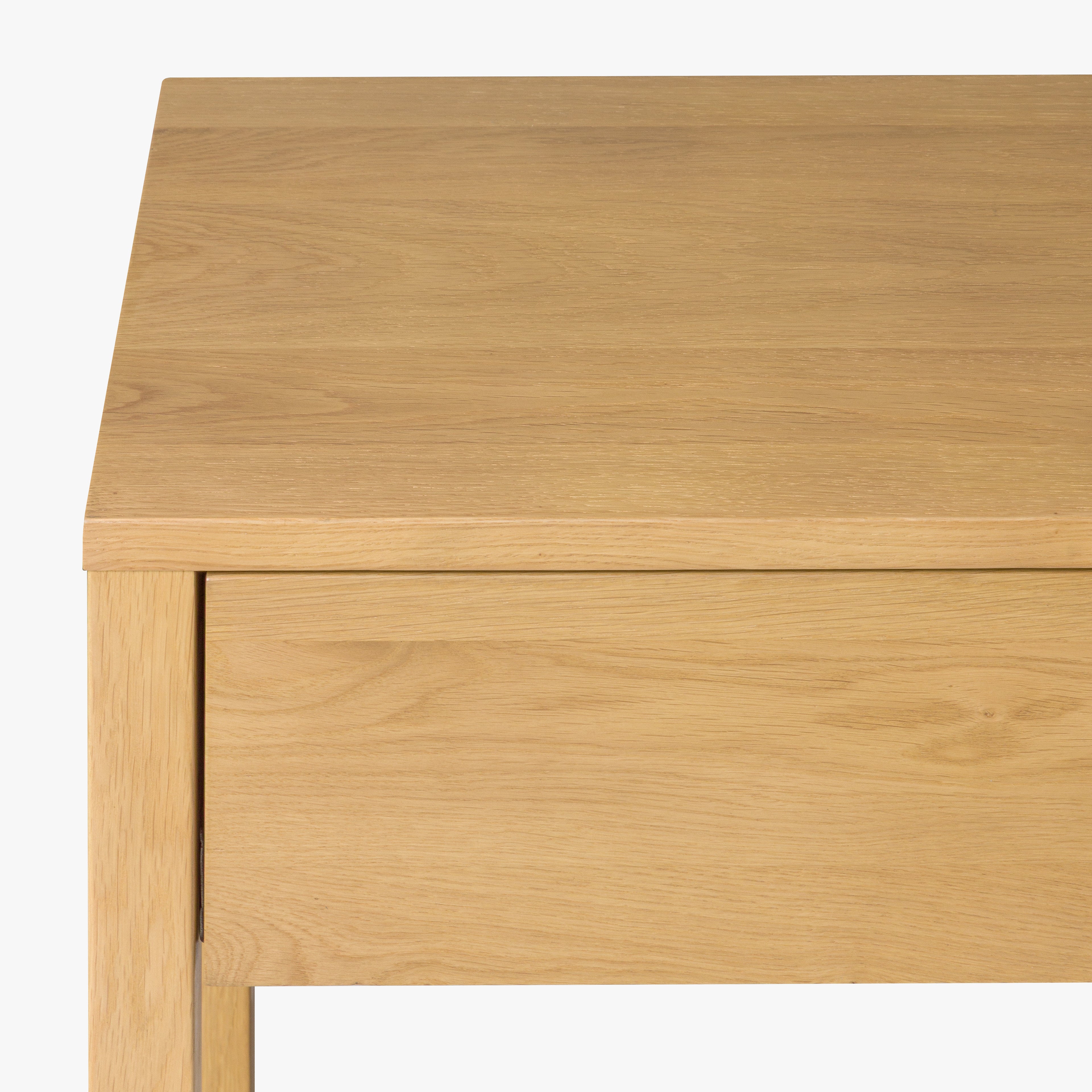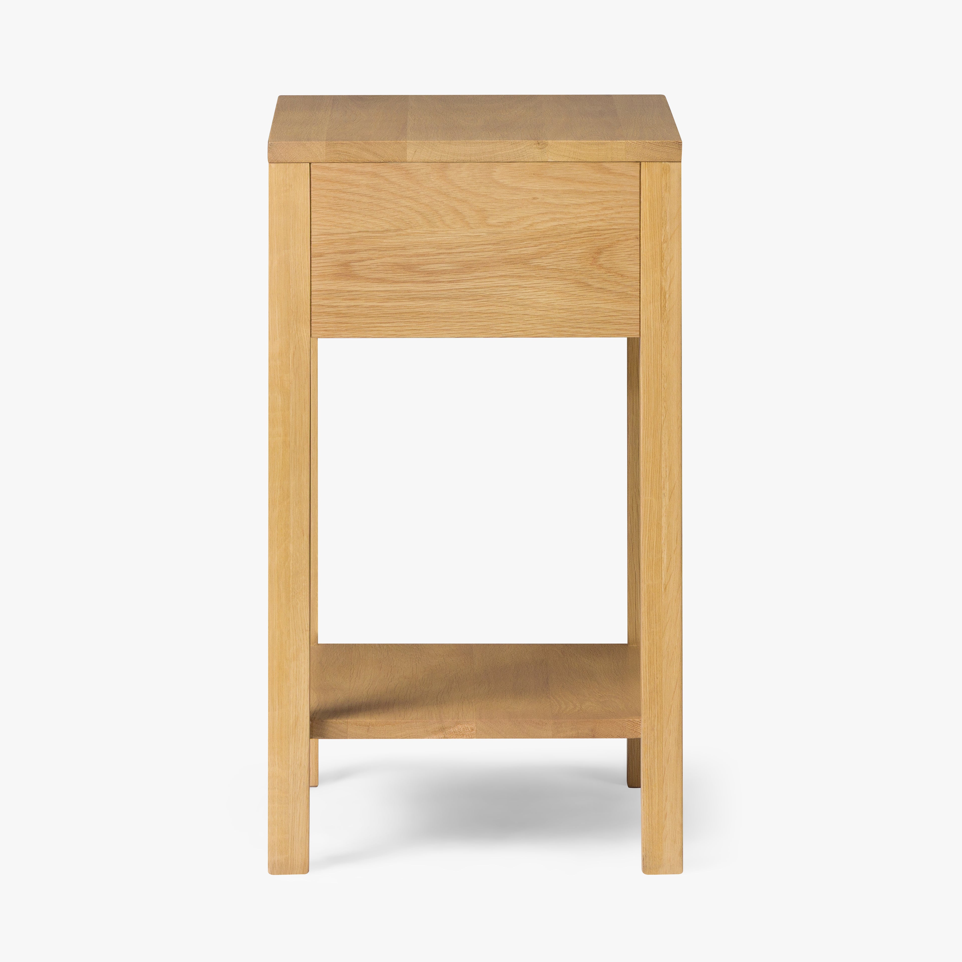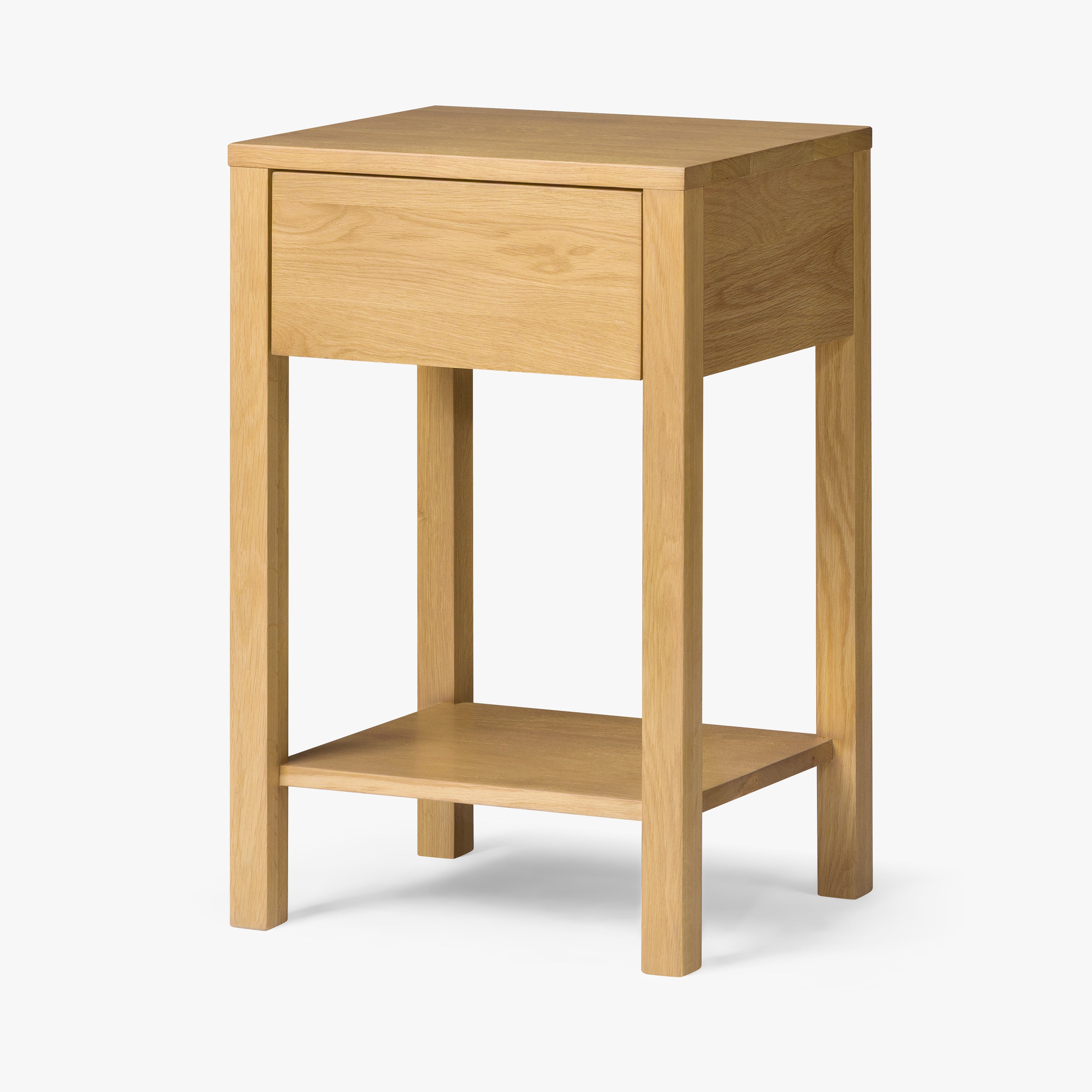 The soft-close drawer runs smoothly and quietly, giving you storage for the things you want tucked away, while the open shelf keeps your favorite book or décor close at hand. Finished in a natural lacquer, the oak feels authentic and warm, while being easy to care for day after day.