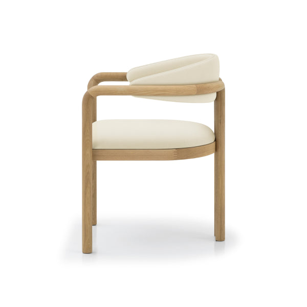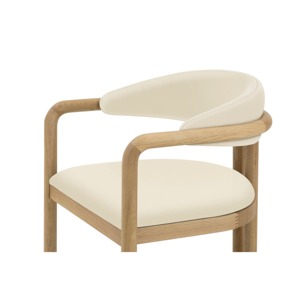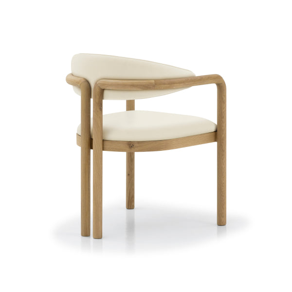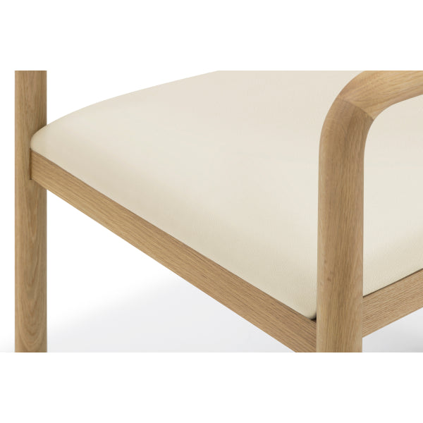 The seat is upholstered in beige vegan leather, offering a soft and supportive surface that balances luxury with everyday practicality. Finished in matte lacquer, the solid oak dining chair highlights the natural oak grain while ensuring durability and easy care.