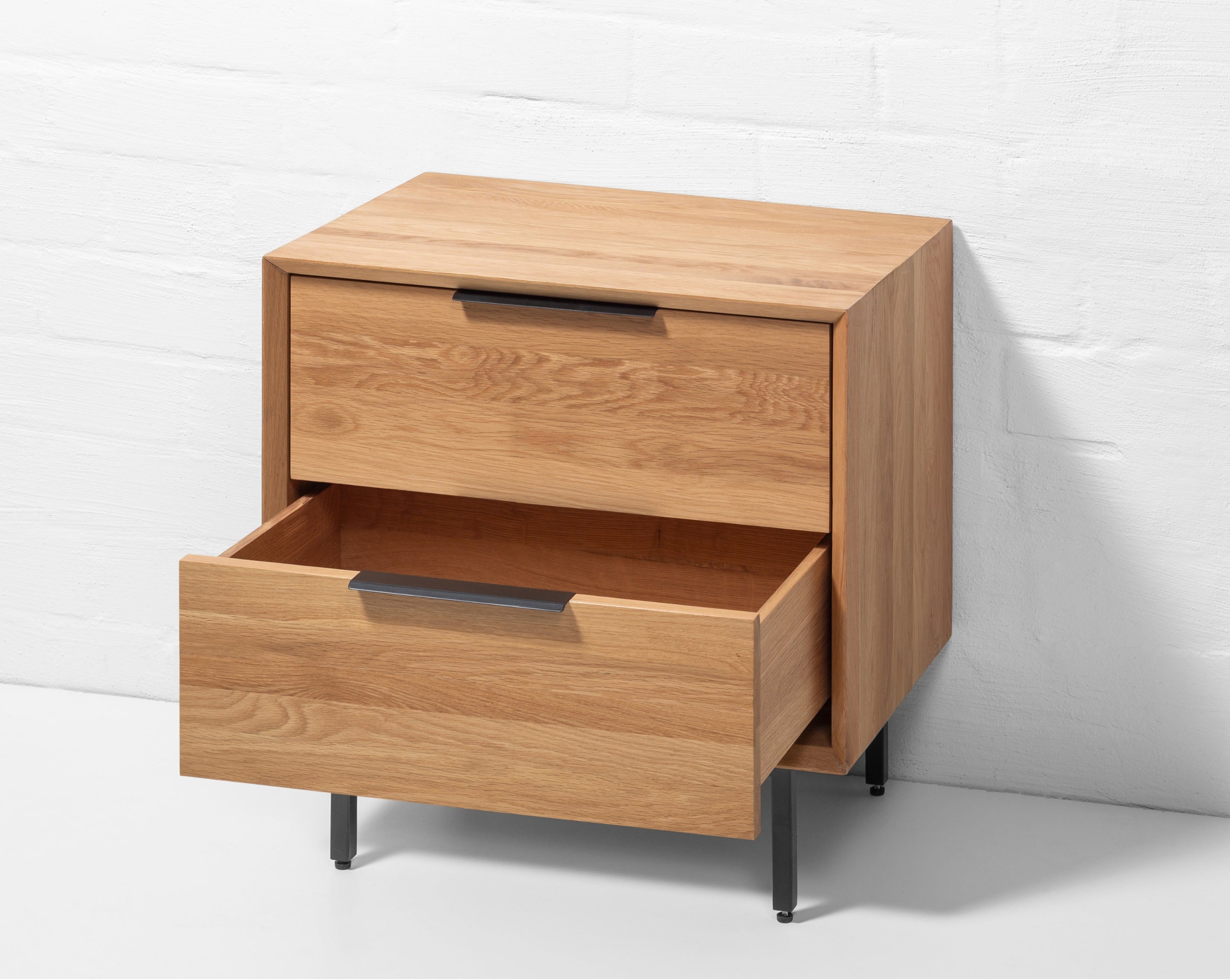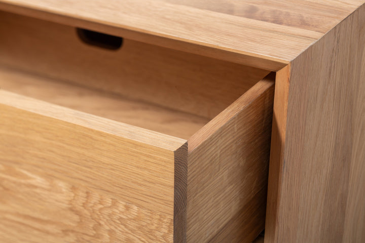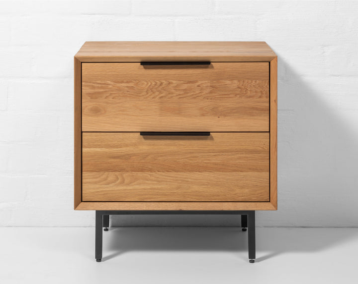 The Bergen nightstand combines solid oak with high-quality oak veneer, offering a design that is both modern and timeless. With its clean lines and compact form, it blends seamlessly into contemporary and industrial-style interiors while adding natural warmth to your bedroom.