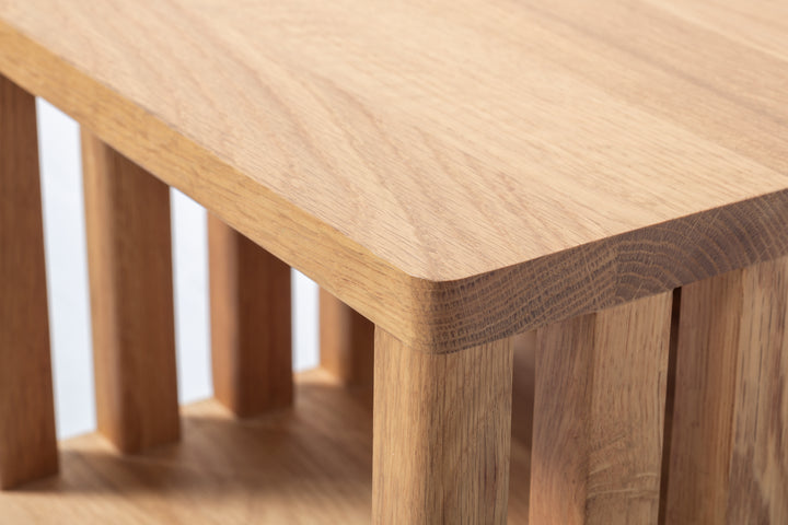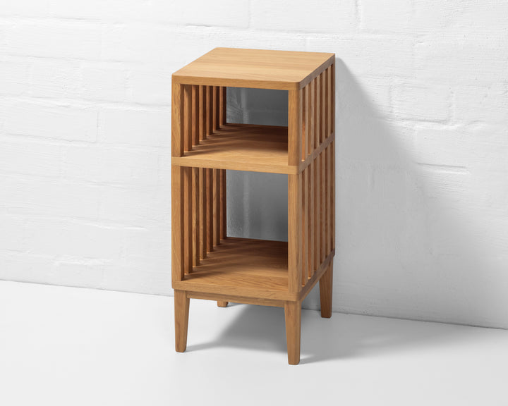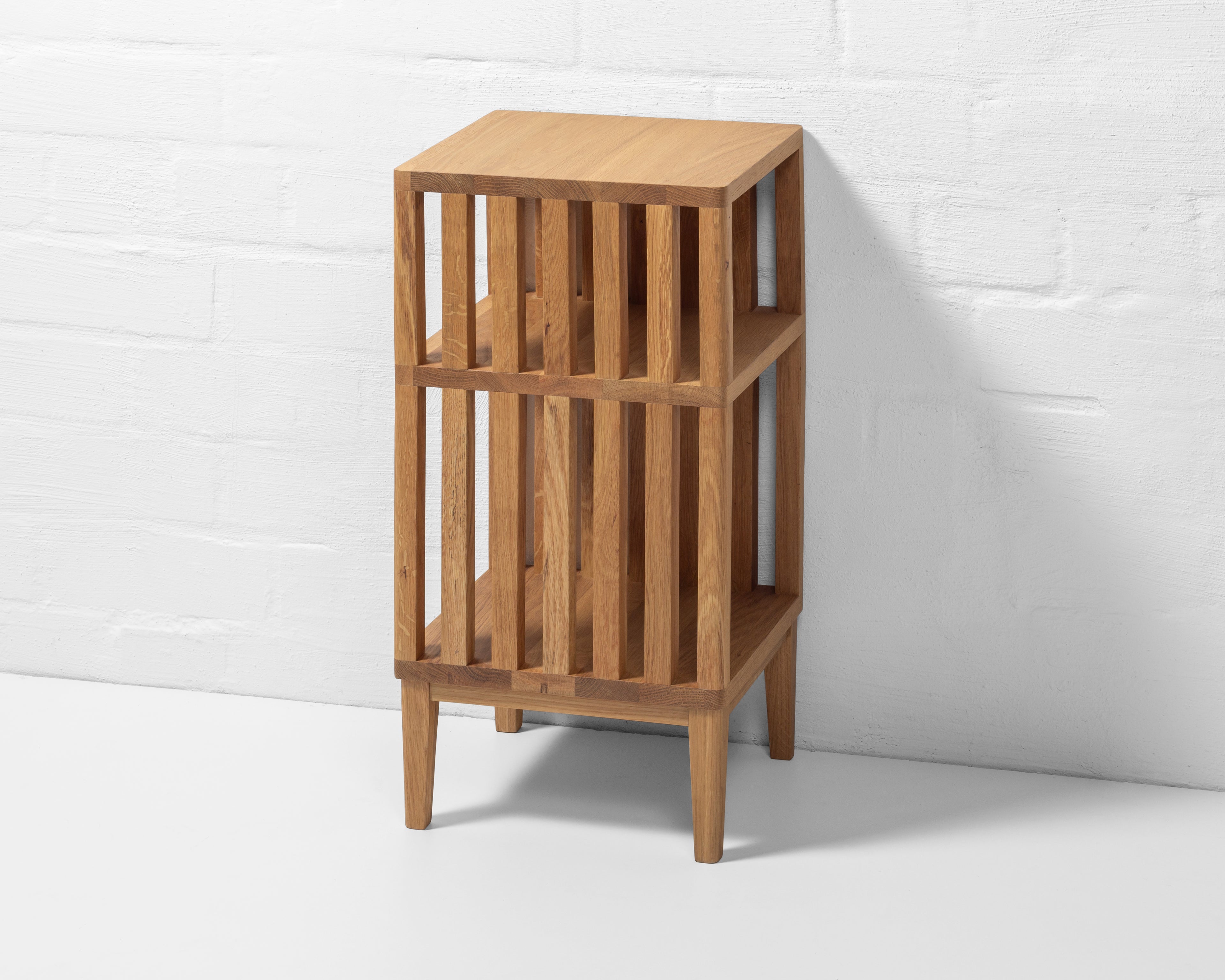 The Jack side table is designed for modern living — slim, smart, and full of character. Handcrafted from solid American oak and finished in a natural lacquer, it blends timeless beauty with everyday function. Two open shelves offer practical storage, while the ribbed back allows wires and chargers to pass through with ease. Perfect as a narrow nightstand in the bedroom or as a stylish side table in the living room, Jack is proof that thoughtful design can fit anywhere.