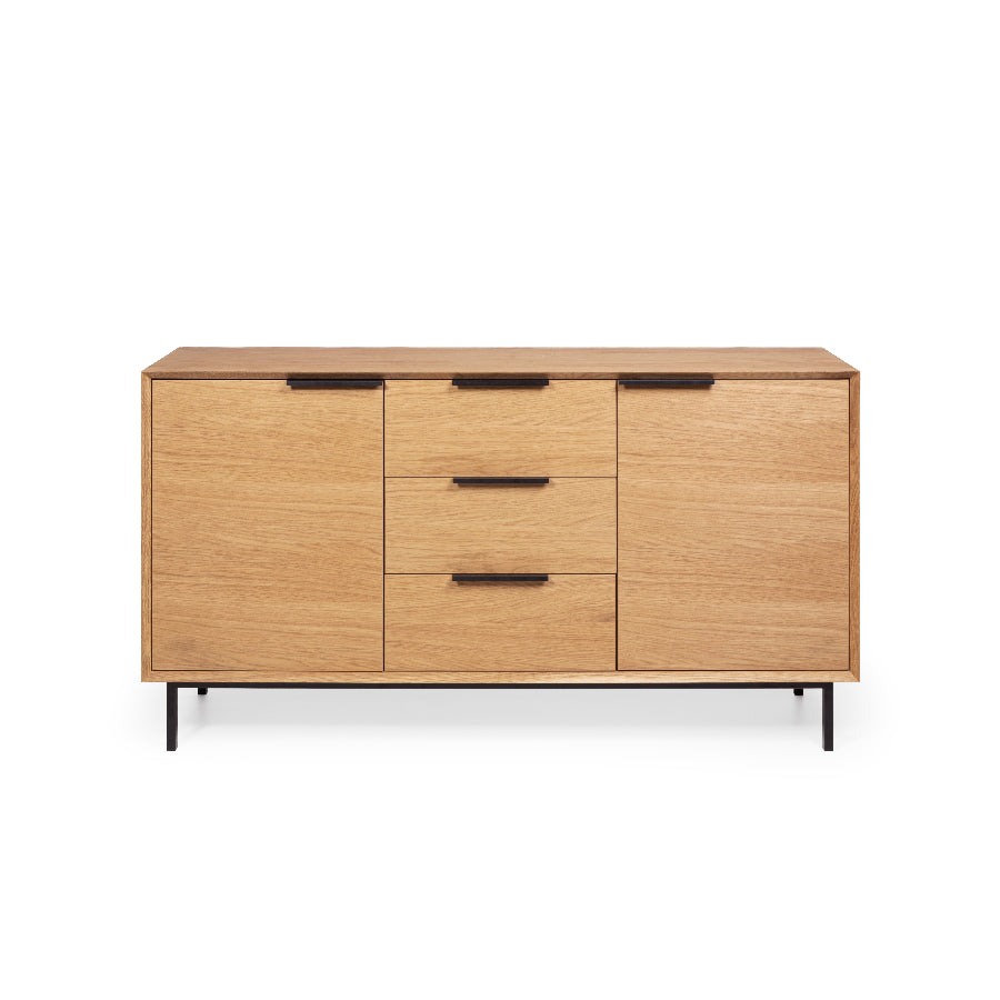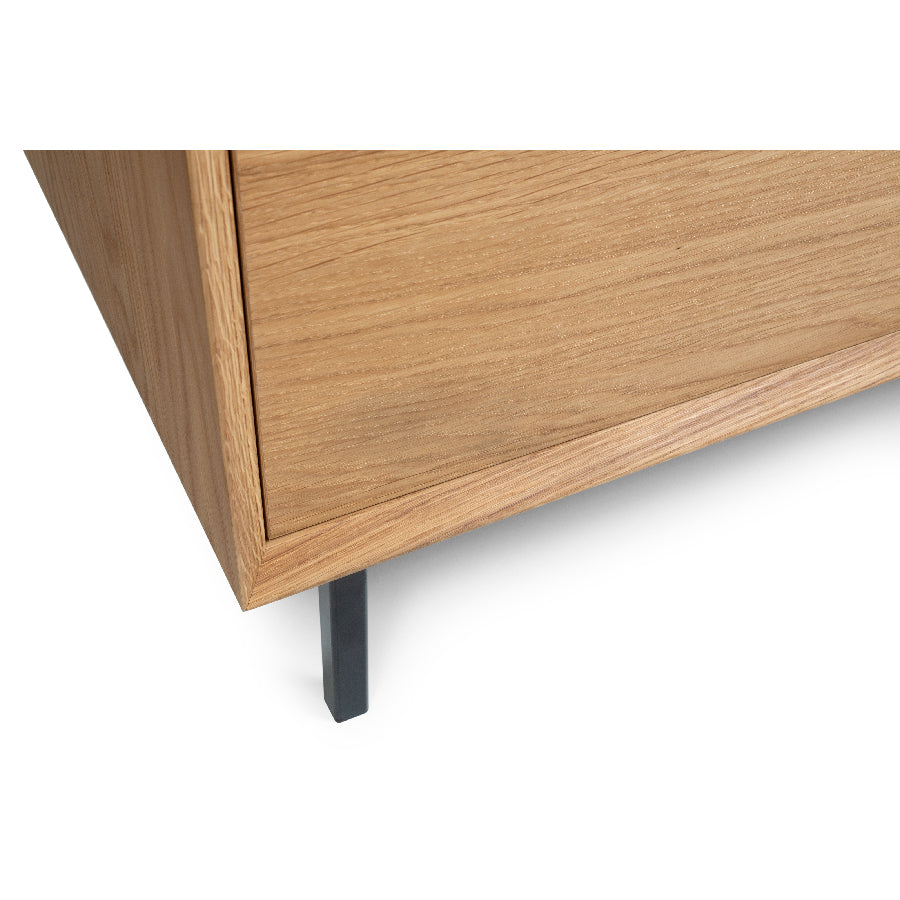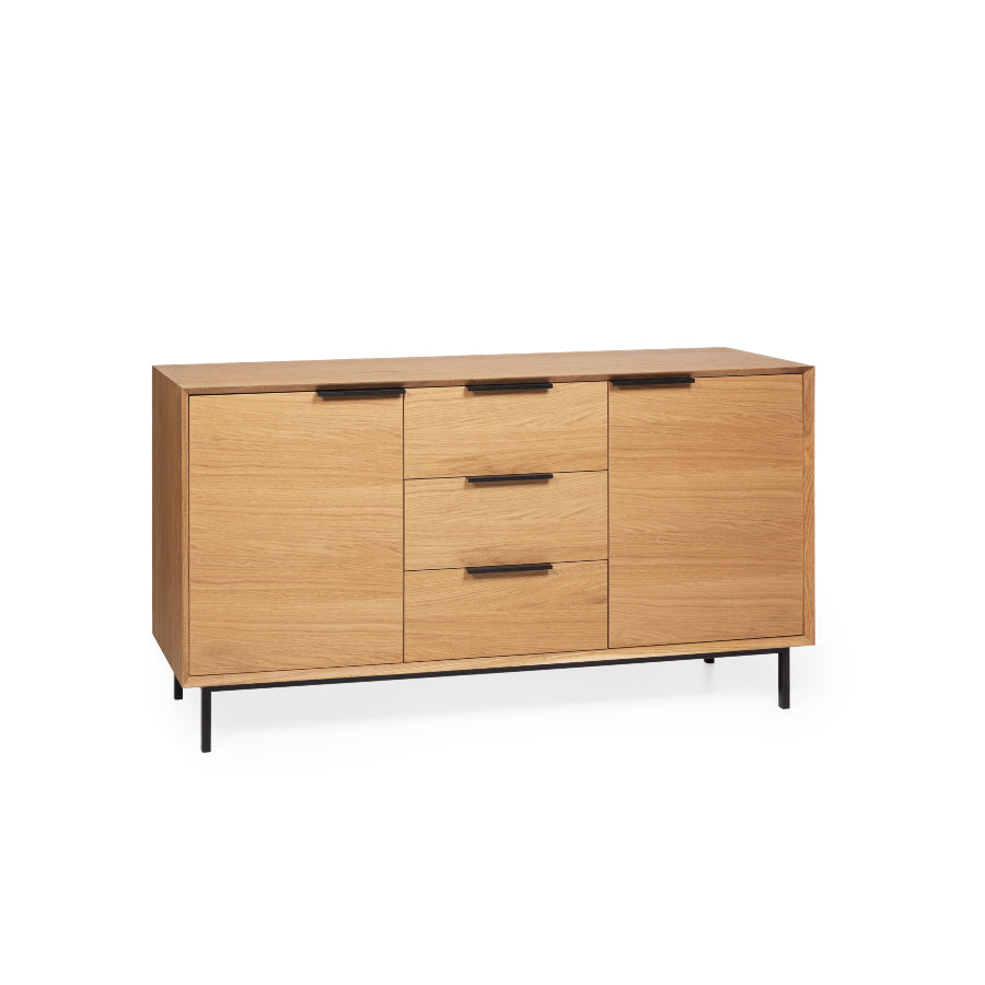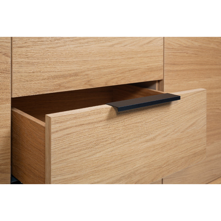 Designed with three central drawers and two side cabinets, Bergen offers generous storage while keeping a refined, balanced look. The smooth, soft-close runners ensure quiet functionality, while the discreet black handles and slim legs give the dresser a contemporary touch.