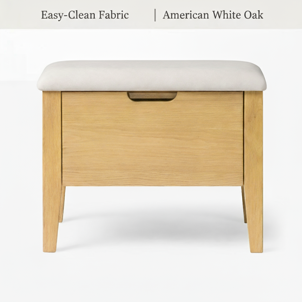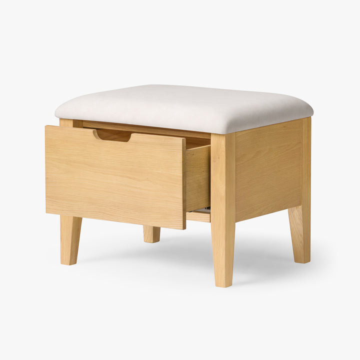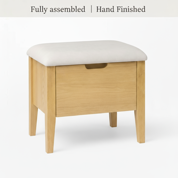Compact yet full of character, the Oslo bench brings elegance and utility together in a refined form. Crafted from solid oak, this smaller version offers a smooth beige leather seat for comfort and a soft-close drawer for discreet storage. Its clean design and natural wood finish make it ideal for hallways, bedrooms, or any corner that needs both seating and storage.