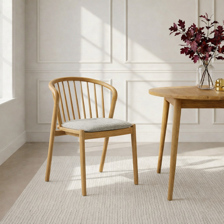 Bring timeless charm to your dining space with the Saga oak dining chair. Expertly crafted from real American wood and finished in a smooth matte lacquer, Saga showcases the natural beauty of oak while providing excellent durability and protection for everyday use. Its elegant spindle-back design and clean lines make it a versatile piece that blends seamlessly into both contemporary and classic interiors.