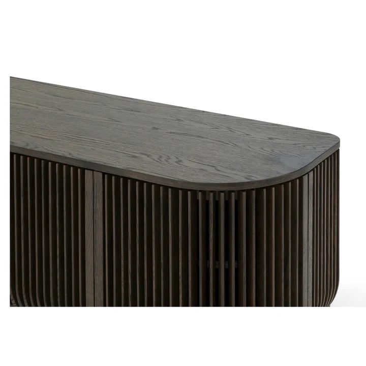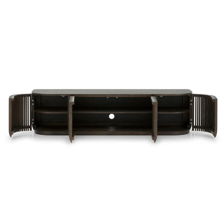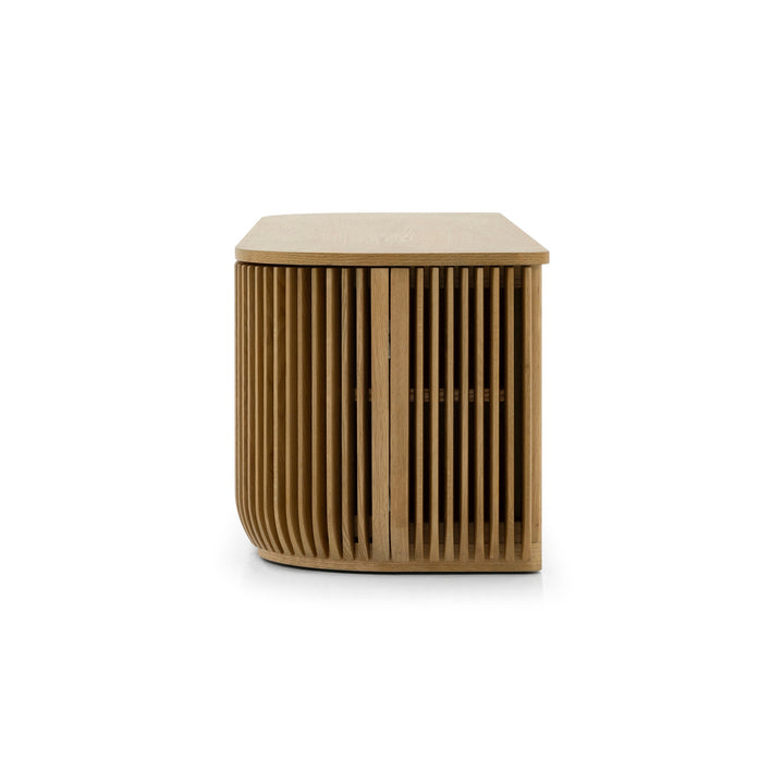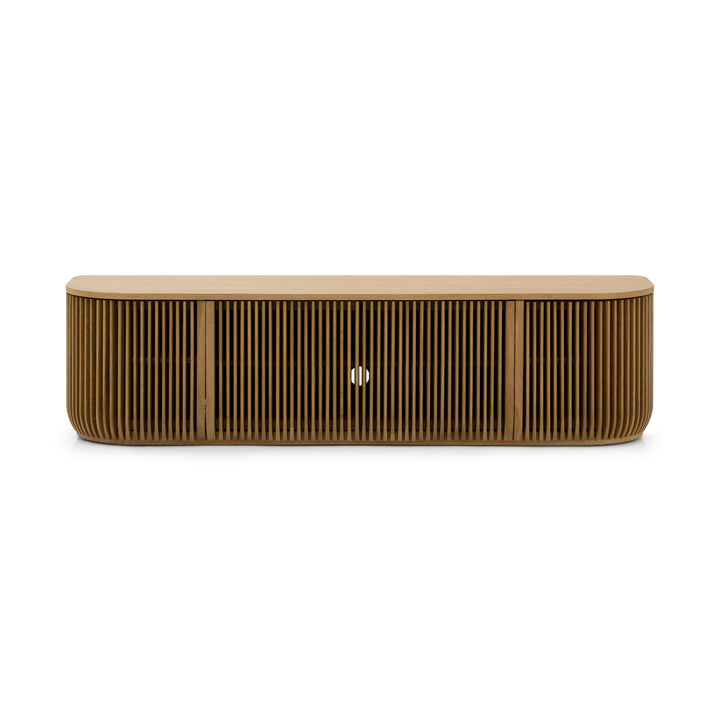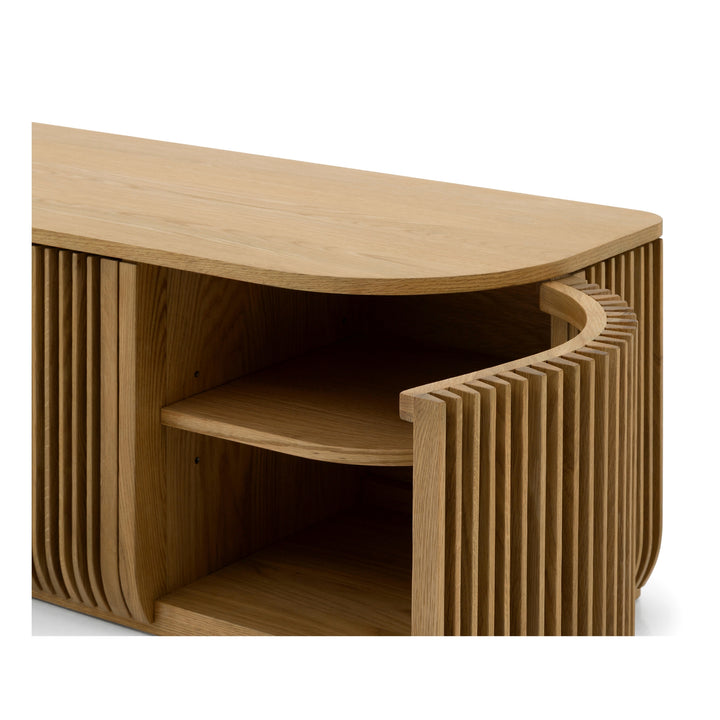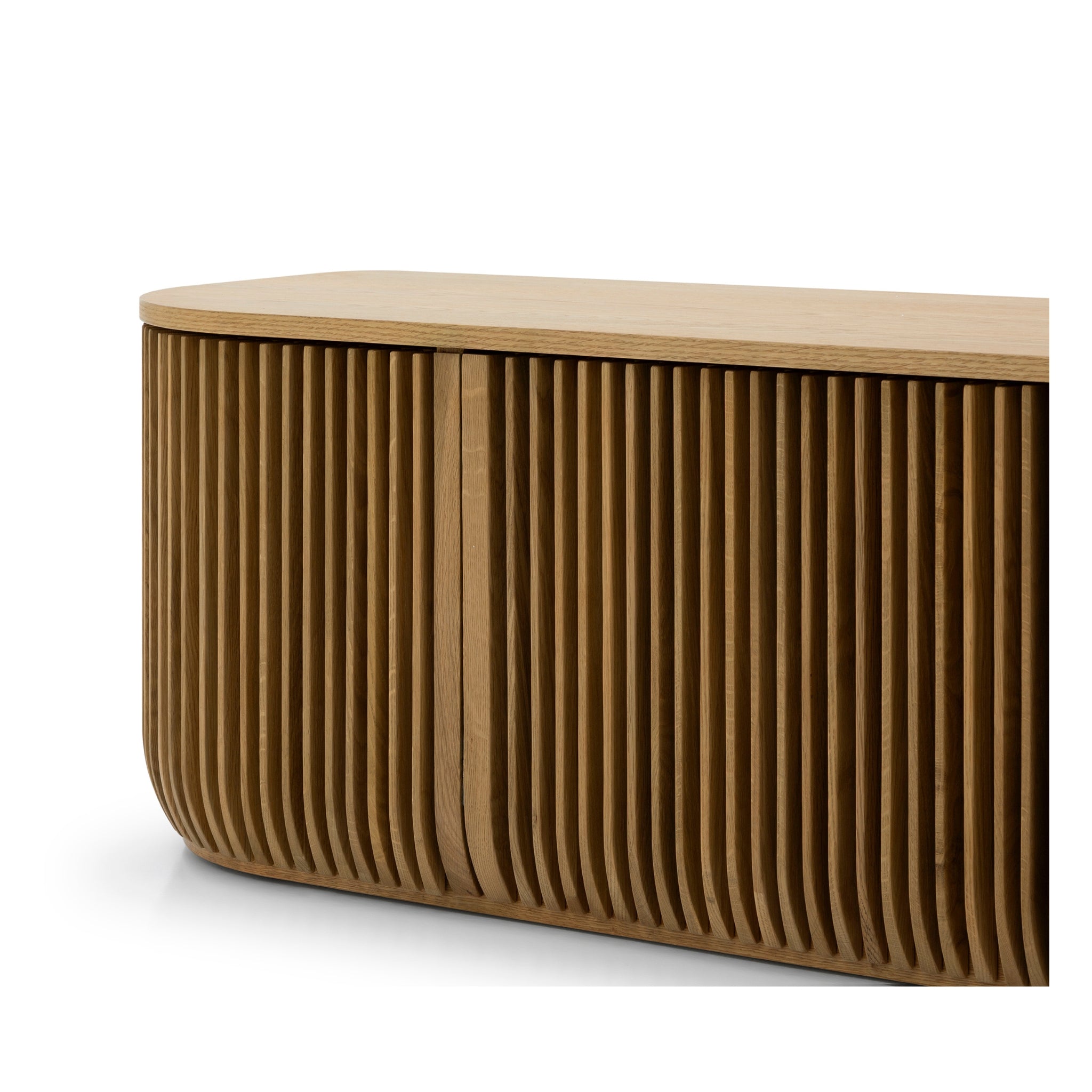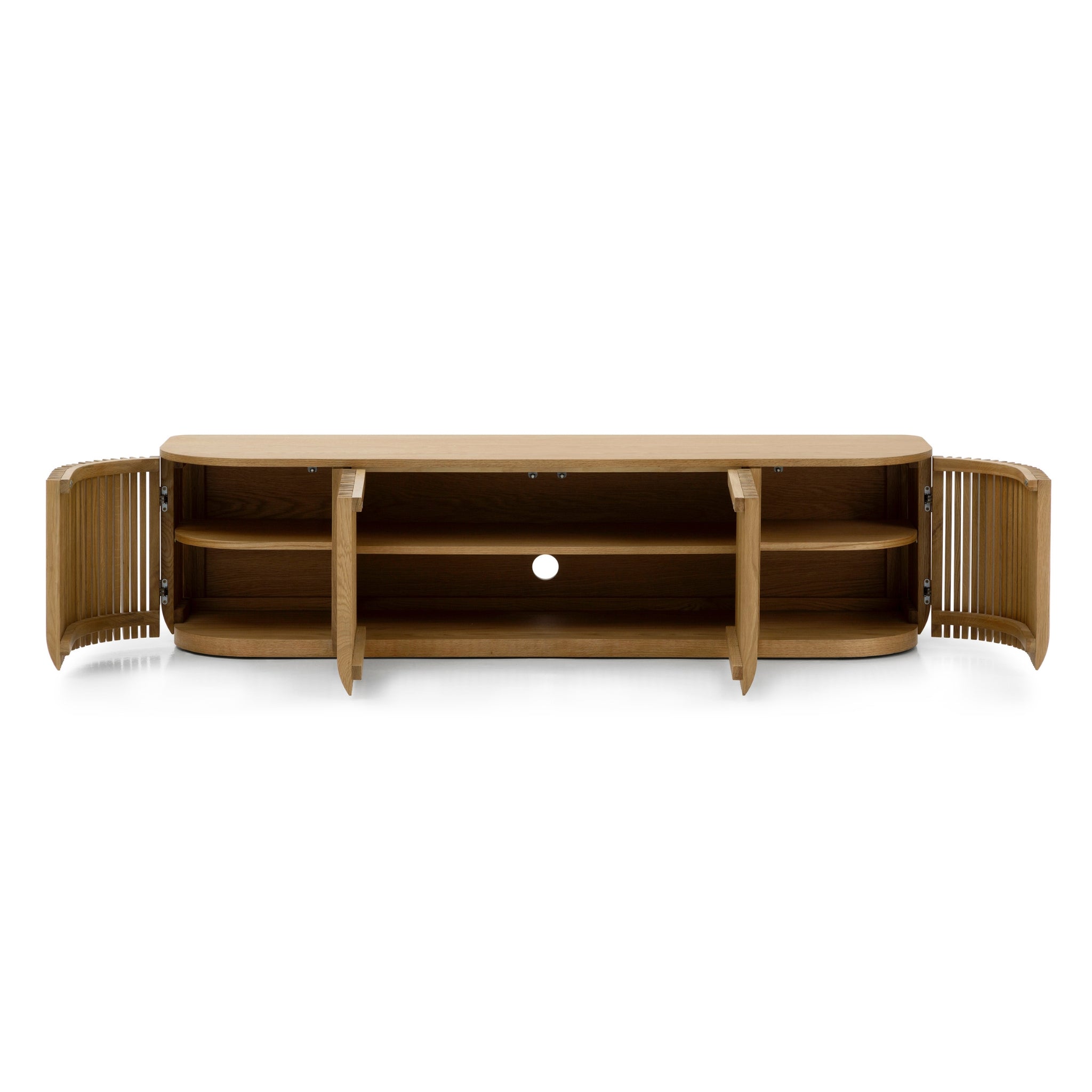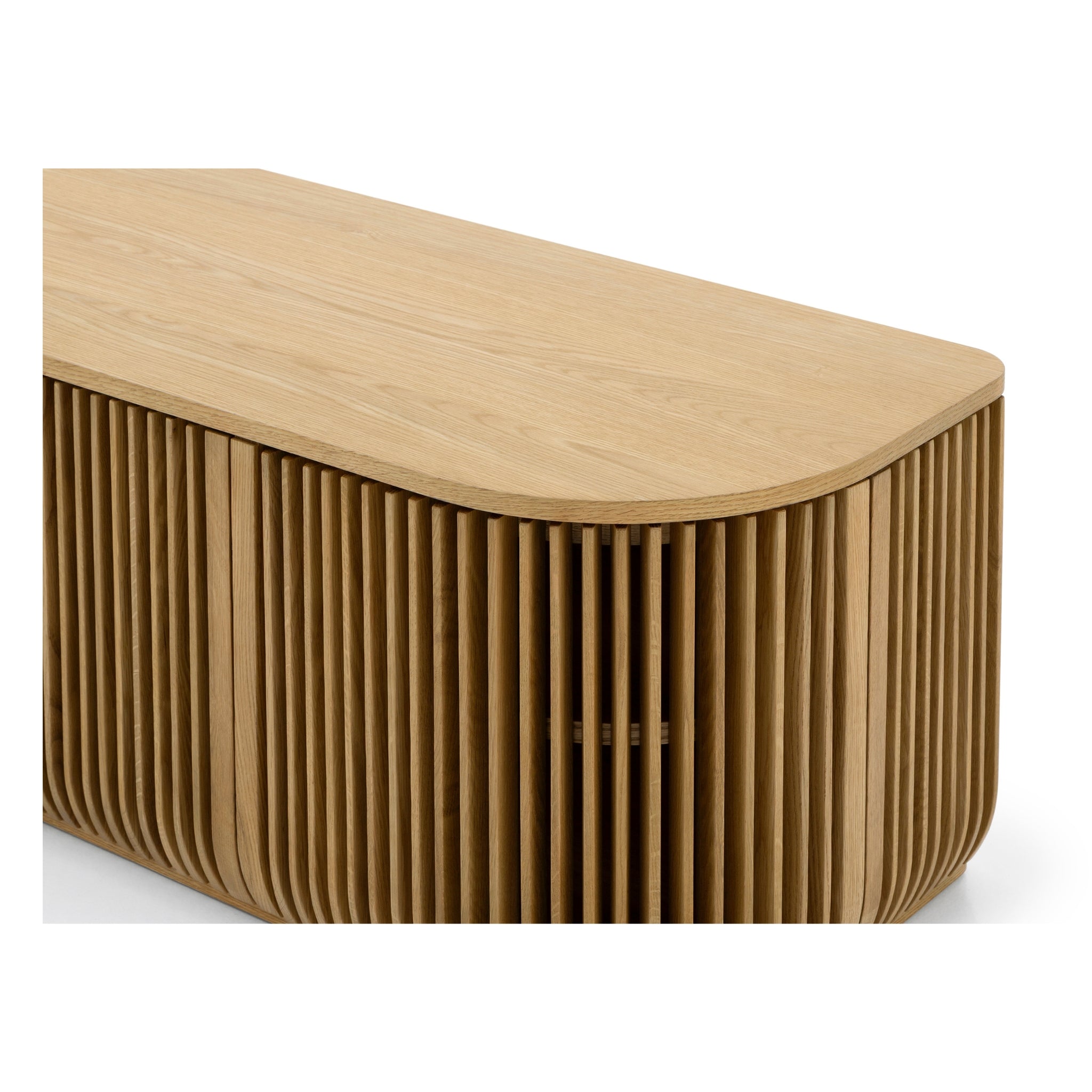 Behind the smooth, easy-gliding doors, there’s generous space to keep media and everyday items neatly tucked away. Finished in matte lacquer, the oak retains its soft, natural feel while remaining simple to care for.