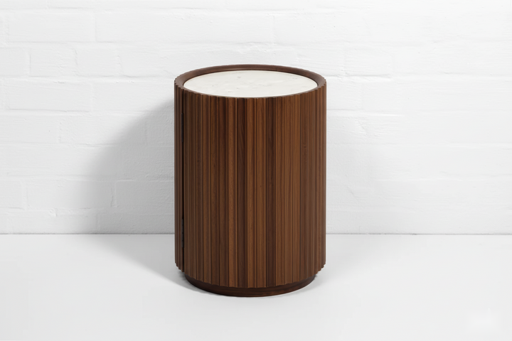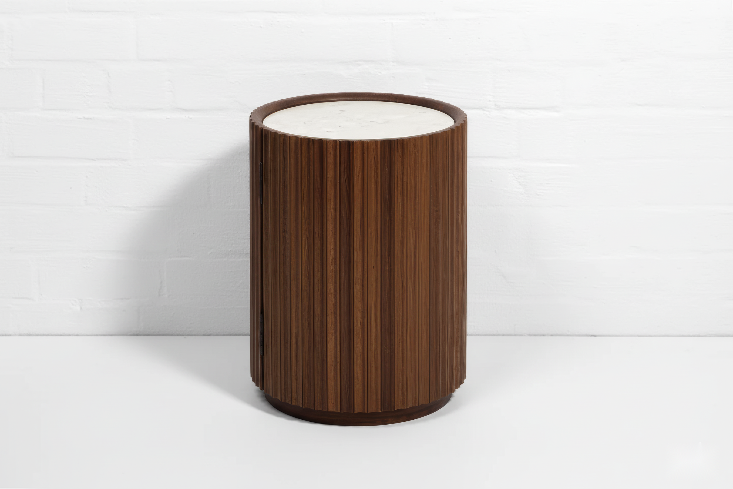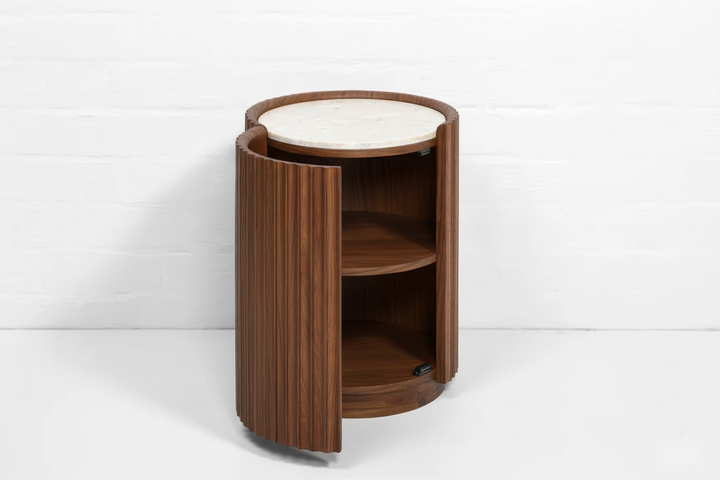 Topped with a refined white stone surface, this wooden bedside table is as practical as it is elegant. Behind the ribbed, textured door are two shelves, giving you discreet storage for books, electronics, or personal items.
